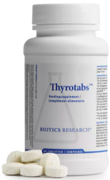 Thyrotabs is a complex blend of pituitary/hypothalamus concentrate and thyroid cofactors, containing essential nutrients such as L-Tyrosine, iodine, and selenium.